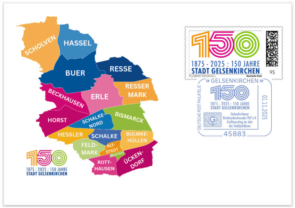 Großtauschtag am 1. November 2025: Plusbrief Individuell und Sonderstempel zu 150 Jahre Stadt Gelsenkirchen erhältlich